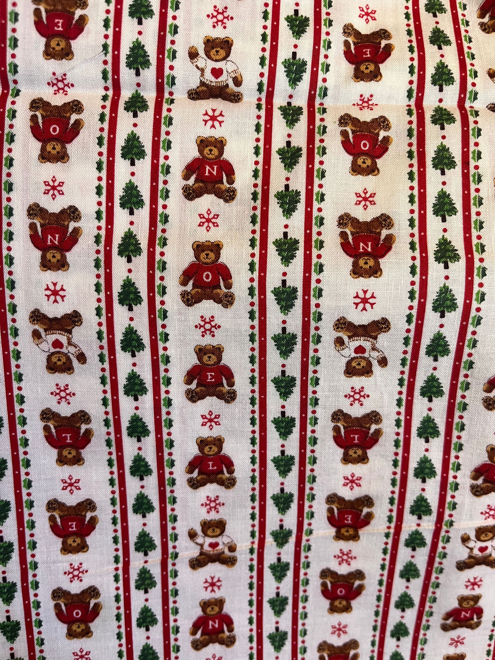 NOEL Teddy Bears and Christmas Trees on White Fabric