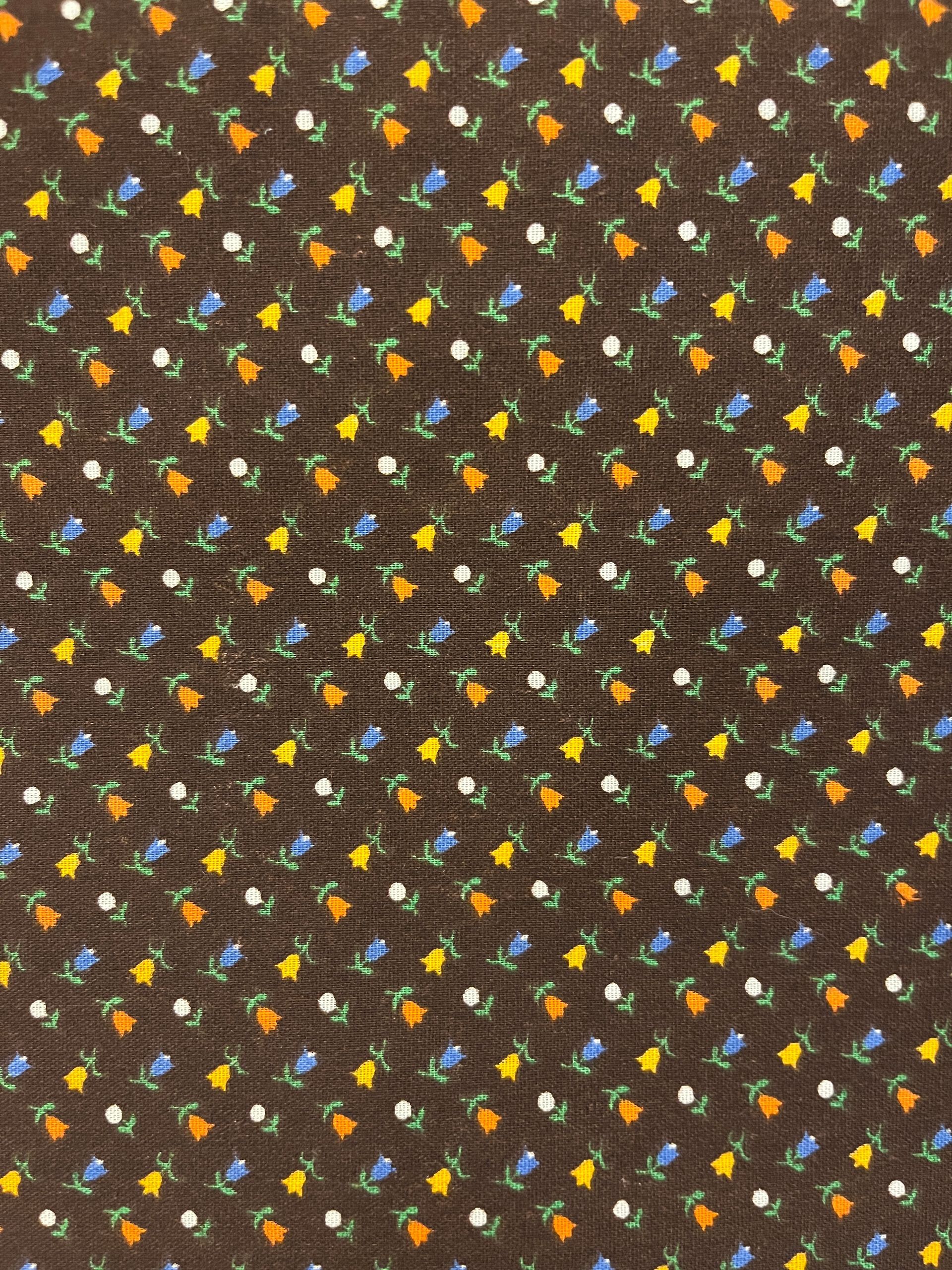 Tiny orange, yellow and blue flowers on brown.